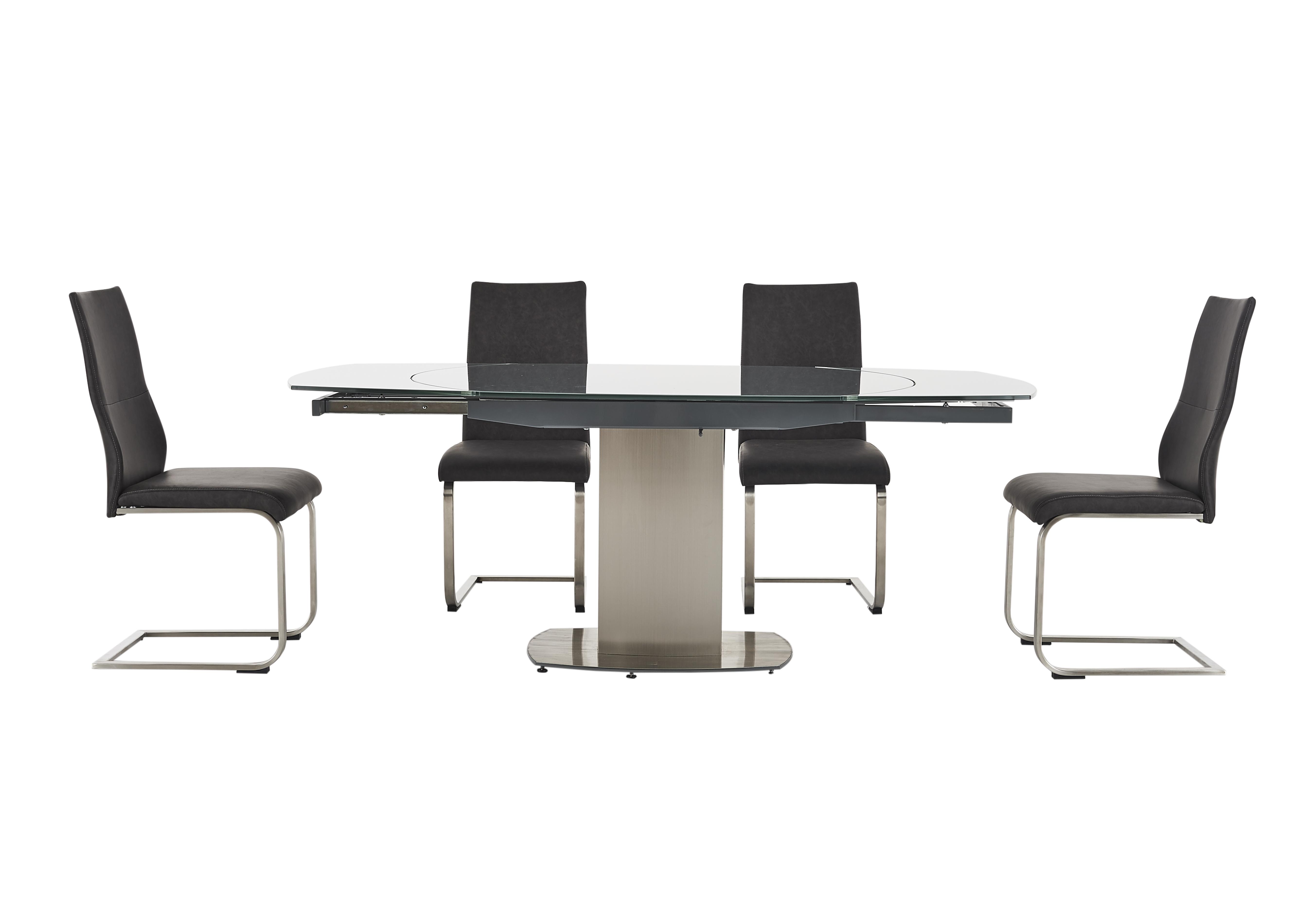 The dining chairs have brushed steel cantilever legs and grey faux leather upholstery.